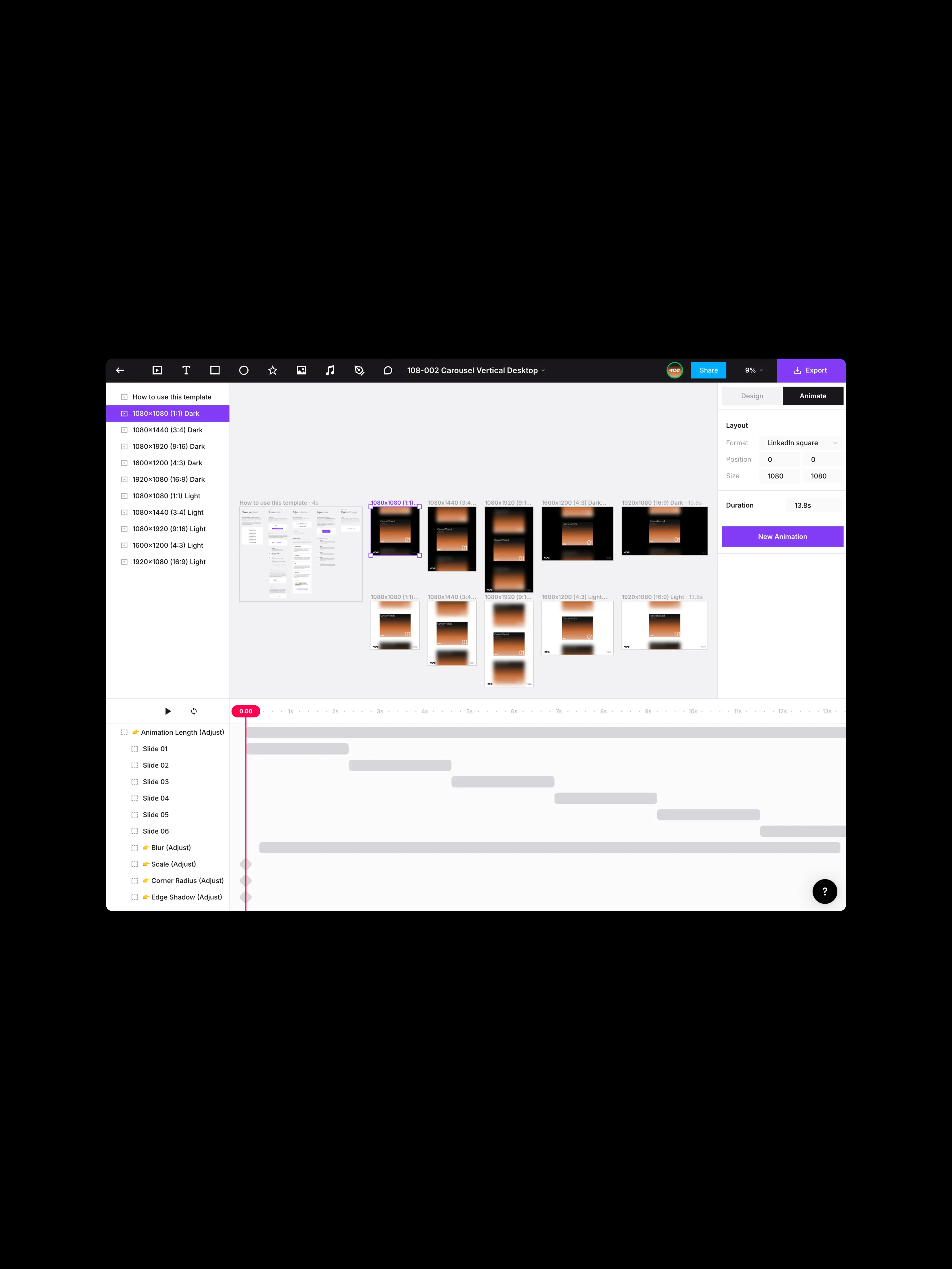 Key settings like animation length, blur, corner radius, edge shadow, scale or rotation are exposed and ready to tweak. No digging through layers. Everything important is already set up. Built to be controlled.